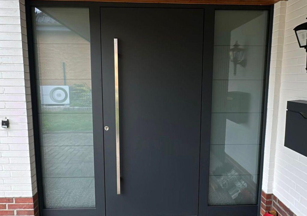 Einbau einer hochmodernen Aluminiumtür mit Gestreiften Milchverglasung